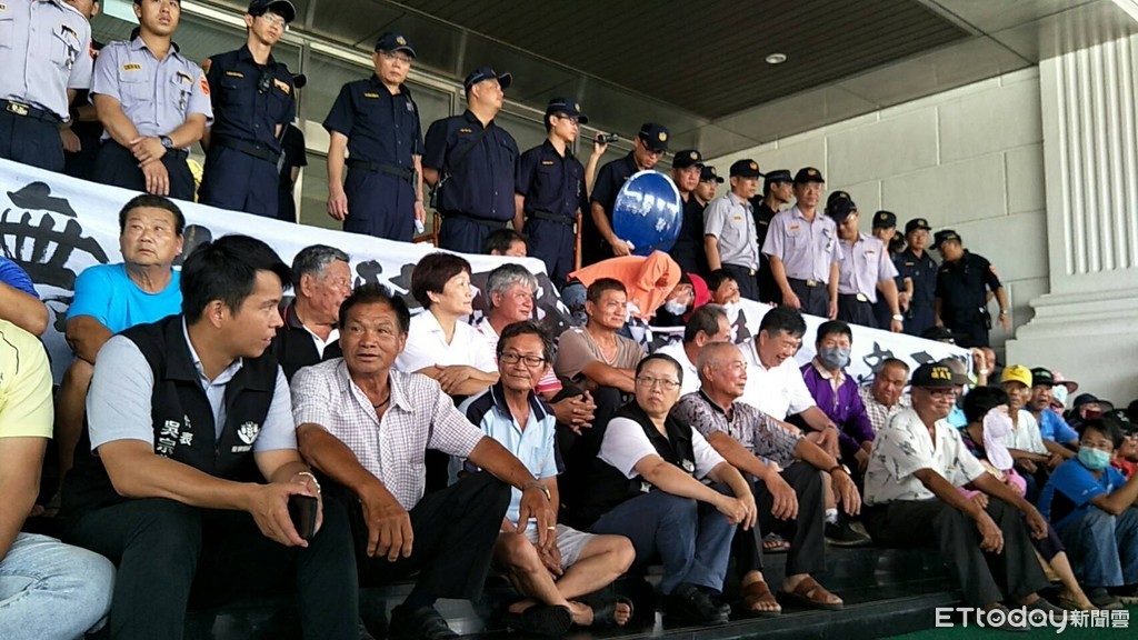約30名居民,拉著「黑心企業 危害鄉民」、「賠償無誠 一騙再騙」等的抗議布條,來到六輕管理處大門口前的階梯靜坐,警方不敢大意,在後頭築起層層人牆,就怕擦槍走火起了衝突,抗議民眾在縣議員許志豪的帶領下,拿著大聲公大喊「麥寮、勇敢站出來!」