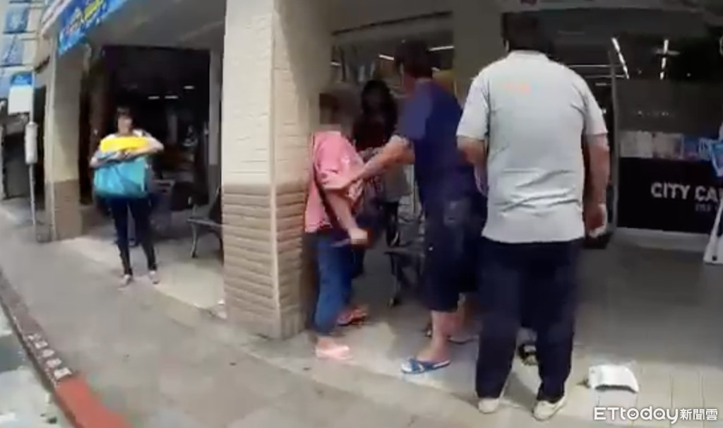 ▲一群人在超商門口發生口角,其中粉色衣服的女子右手持水果刀,最後被員警奪下。(圖/記者柳名耕翻攝)