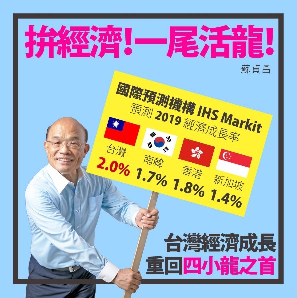 蘇貞昌19日於LINE官方帳號表示,根據國際預測機構IHS Markit發佈最新預測,台灣經濟成長率為2.0%,勝過香港的1.8%、南韓的1.7%、新加坡的1.4%,宣布台灣重回亞洲四小龍之首。