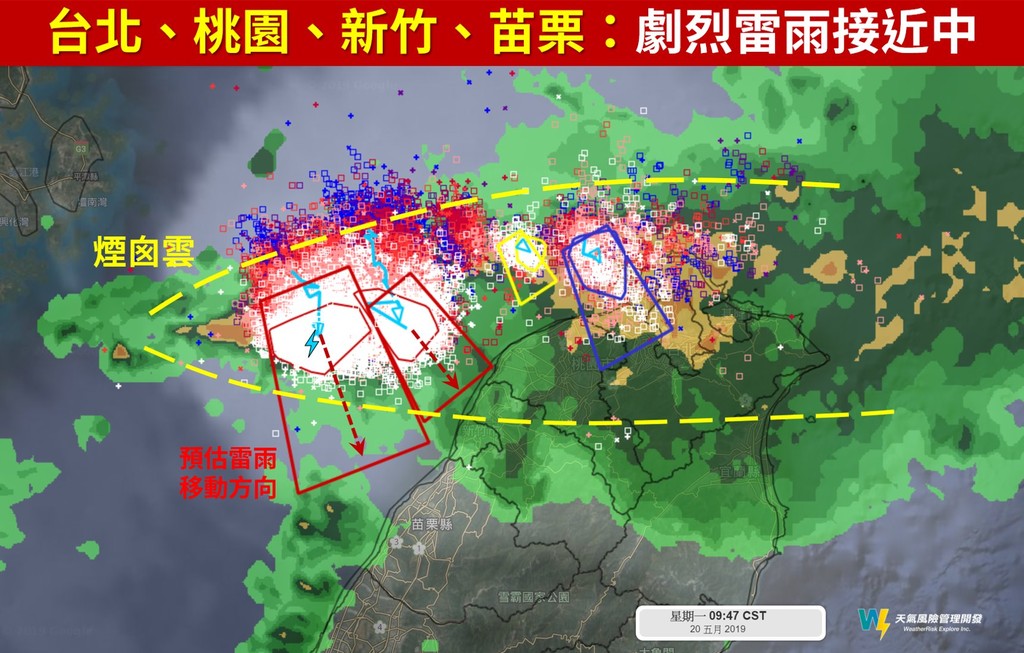 天氣風險公司也在臉書提醒,煙囪雲出現,苗栗以北劇烈雷雨接近中,「一顆很完整、典型的煙囪雲,出現在北部外海,正在逐漸向南推展中」;密集閃電不斷在「煙囪頭」上冒出,對流、回波也向中低層的風向傳播,讓下游持續有劇烈雷雨發生,北部要特別留意持續性的大雷雨。
