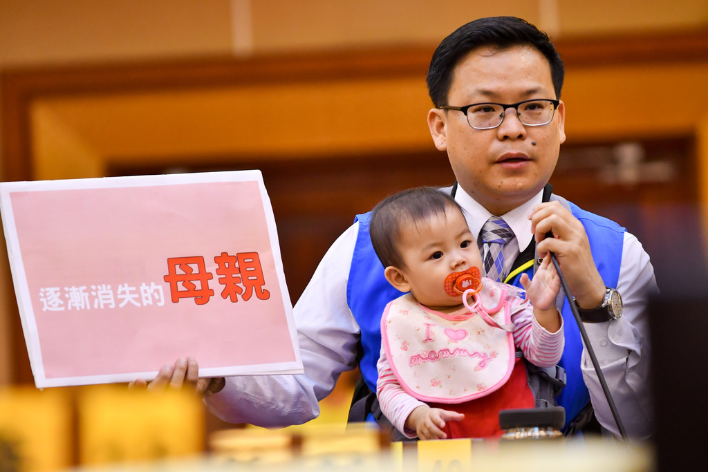 曹嘉豪指出,今天揹著小女兒推推一起出現在議會,主要是為了提高生育率才會喊出「搶救母親大作戰」,「母親」這個角色卻可能逐漸在消失,根據兒福聯盟的數據顯示,台灣總生育率已連續四年下滑,「不必生」、「不想生」、「沒有條件生」越來越多。