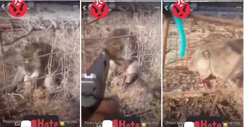 據馬來西亞《中國報》報導,從約20秒的影片可見,猴子無助地被關在籠內,對於即將到來的厄運渾然不覺,還一度低頭理毛,而持槍男子則以槍指著猴子頭部,要求3秒內喊出「親親寶貝」(Baby Sayang),但猴子自然無法領會,持槍男竟因此直接近距離將猴子一槍爆頭。