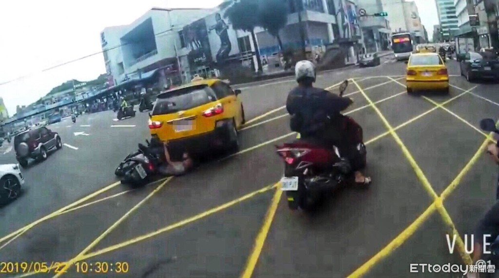 5月22日上午10時許,基隆市愛三路與仁二路口,一名目擊者表示,一輛計程車運將司機下車查看,倒在路中央的機車,正要靠近機車時,被自己所駕駛的計程車捲入車底。畫面顯示倒車燈是亮的狀態。還好一名剛好路過的機車騎士機靈,馬上停車快速打開車門,將手煞車拉起,避免車輛繼續往後倒車。後續待由轄區警方進一步釐清。