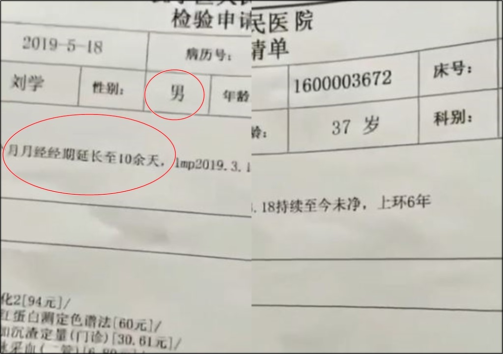 根據中國新聞網報導,劉男18日前往當地一間撫寧區人民醫院做健康檢查,但他手上拿的醫院開立的檢驗申請單卻看見,明明患者性別欄寫上的是男性,但「病史及特徵」內容卻顯示,他「近三個月,月經經期延長至10余天,1mp2019.3.18持續至今未凈,上環(避孕環)6年」。