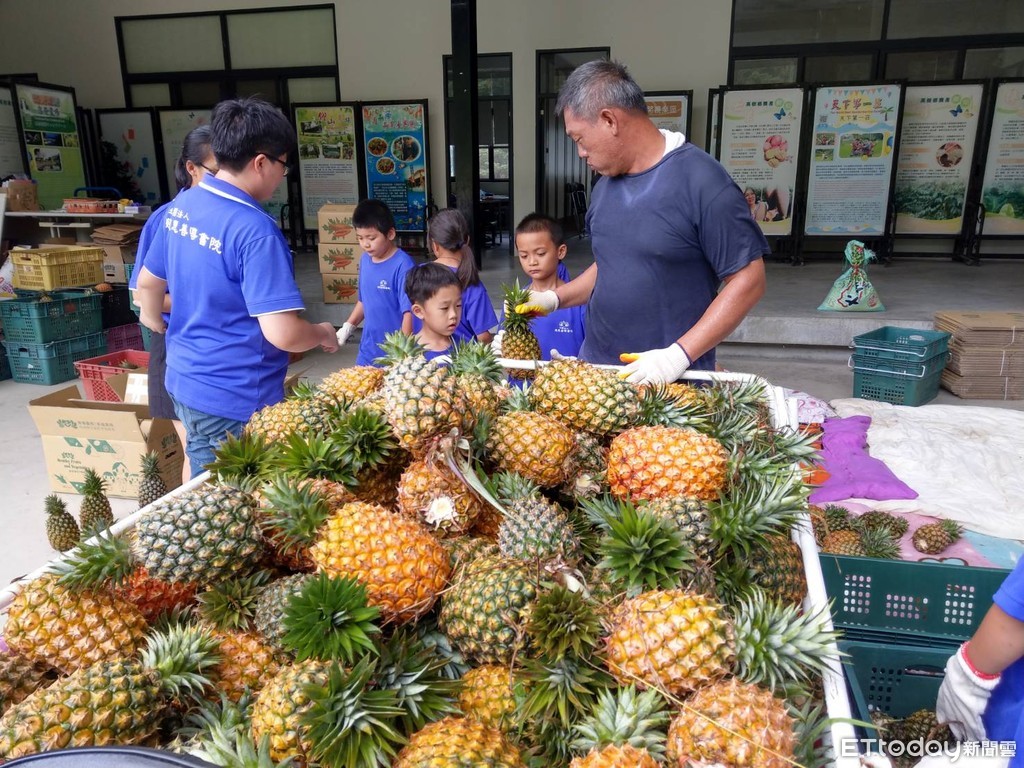 由於較一般鳳梨慢半個月,最近才開園收成,孩童很興奮,跟著大人到田裏採鳳梨,鳳梨多刺怕學童受傷,只讓他們幫忙把鳳梨集中及分級等較輕鬆工作。