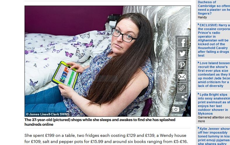 英國埃塞克斯郡(Essex) 的37歲女子尼普斯(Kelly Knipes)無數次從睡夢中醒來時,竟發現自己網購了許多商品,而且都有收據。
