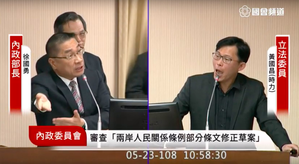 立法院內政委員會23日審查《平均地權條例》部分條文修正草案,時代力量立委黃國昌不滿只排審委員所提的修正案,未讓行政院有「門牌揭露」「預售屋實價登錄」的版本併案審查,在質詢上與內政部長徐國勇發生「跳針口角」,黃國昌跳針質問「沒有預售屋的登錄你接受不接受?」徐國勇則跳針回答「我沒有撤回!」兩人一問一答重複約20多次,氣氛超火爆。