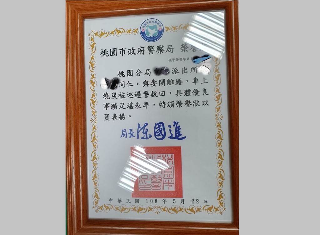 榮譽狀上寫道,「桃園分局某派出所同仁,與妻鬧離婚,車上燒炭被巡邏警救回,具體優良事蹟足堪表率,特頒榮譽狀以資表揚。」