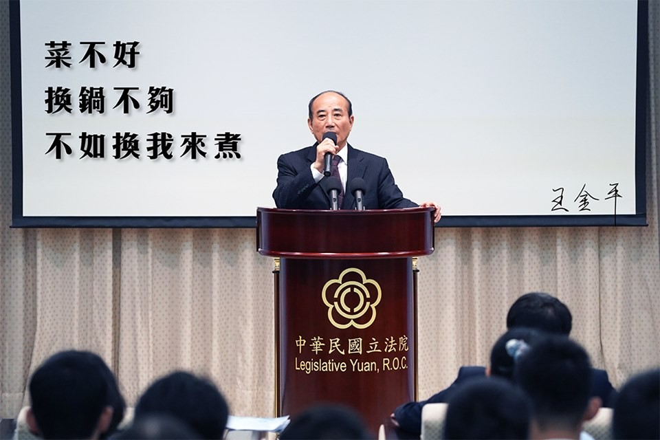 王金平意有所指地說,「有人說菜煮不好,要換鍋子煮。但我認為,菜煮不好,換鍋子用處不大,要換人煮。擁有最豐富從政經驗、資歷最完整且能夠調和鼎鼐、化解衝突的人,才是台灣未來最需要的總舖師人選。」