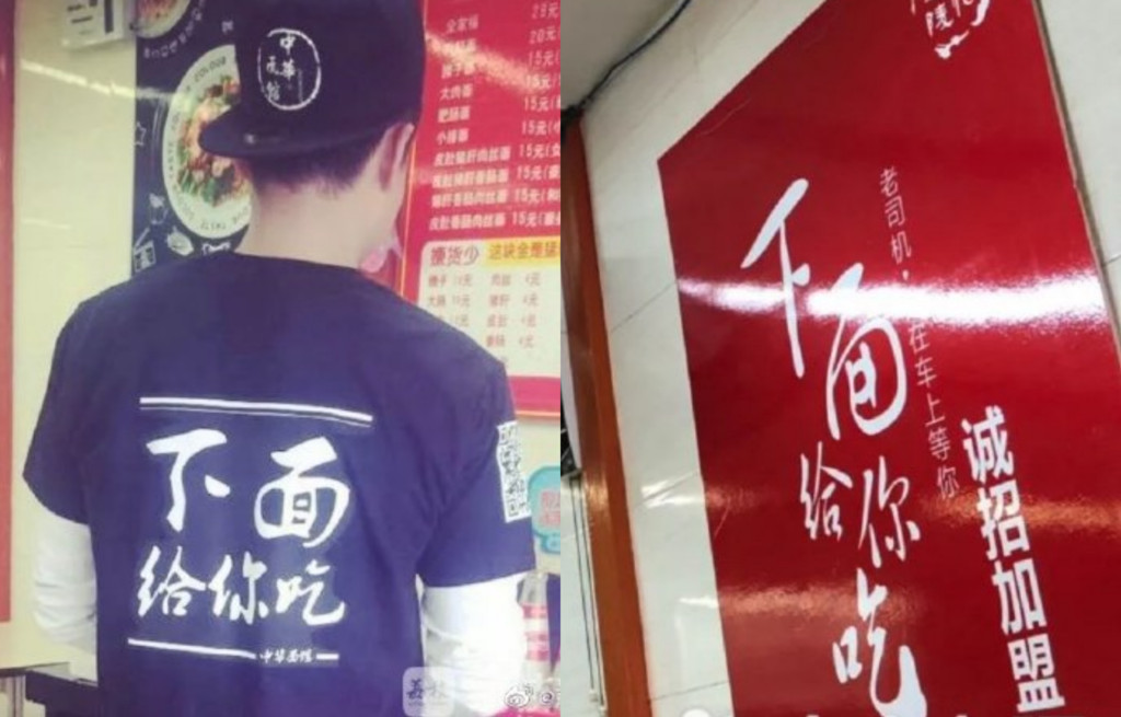 位於南京河西萬達廣場的「南湖中華麵館」打出超狂廣告,在店門、墻面等都印了「下面(編按:麵的簡體字為面)給你吃」、「下面夠硬」的宣傳語,引人聯想到「18禁」東東,被市民投訴「很低俗」。無獨有偶,杭州更有小吃店直接叫做「大叔下面給你吃」,被認為有影射意味,但不少網友認為「小題大做,別想歪就好」。