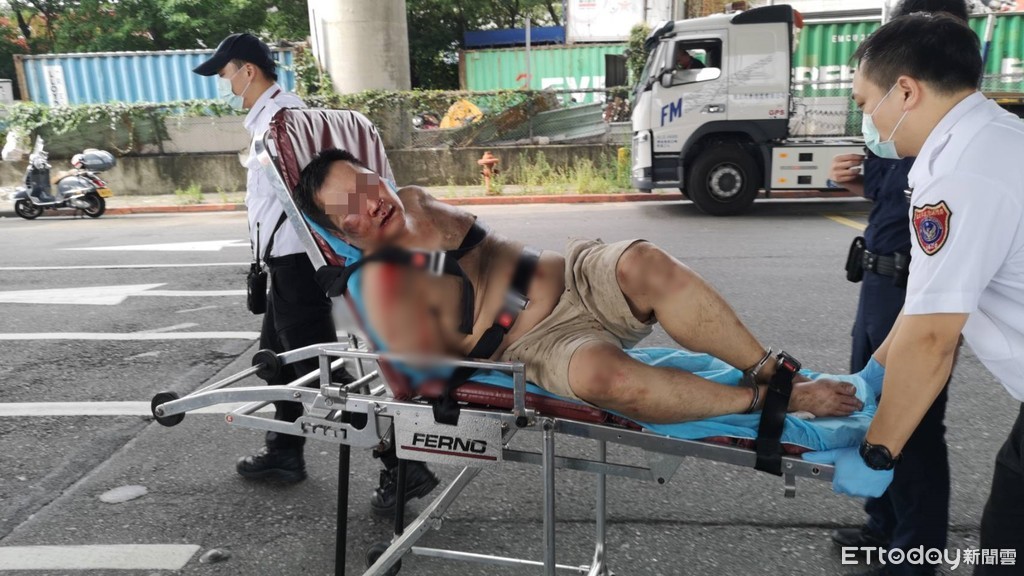 ▲毒蟲拒捕遭擒抱撲倒、警棍招呼,送醫時臉腫成豬頭。(圖/記者黃彥傑攝)