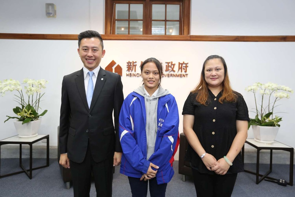▲新竹市長與「泰雅女戰神」陳馨合影。(圖/記者李朝煌攝)