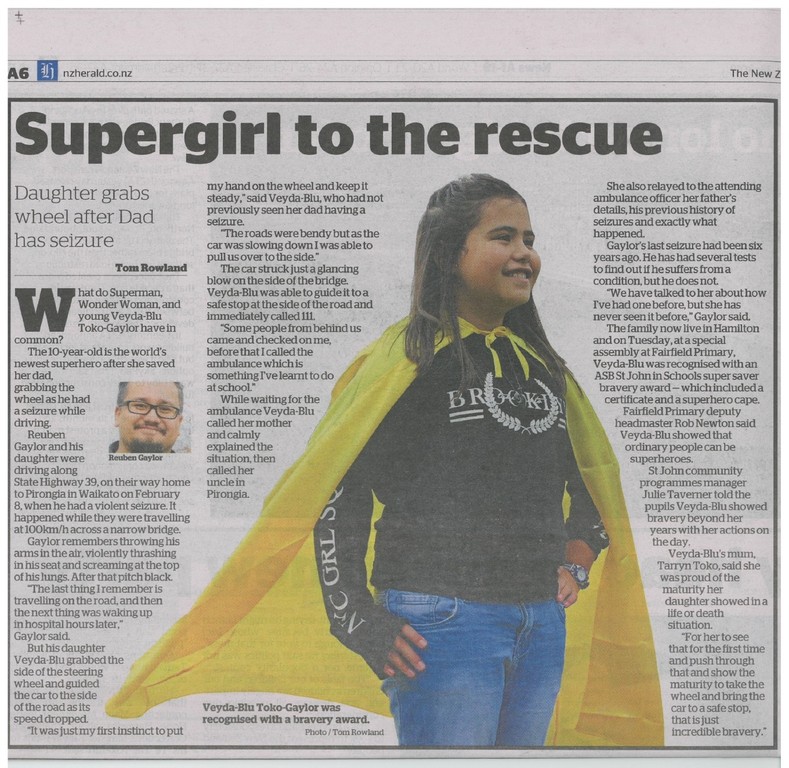 紐西蘭北島漢米爾頓(Hamilton)10歲女孩薇達布魯(Veyda-Blu Toko-Gaylor)日前放學後,坐上來接她的父親魯本蓋洛的車,沒想到父女倆開心兜風到半途,魯本卻忽然癲癇發作,昏倒在駕駛座上。薇達布魯見狀臨危不亂,用手奮力抓住方向盤,控制車輛撞上一旁草叢,才避免一場悲劇發生,並冷靜地打電話報警及通知媽媽,事後她英勇的事蹟也被電視台採訪報導。