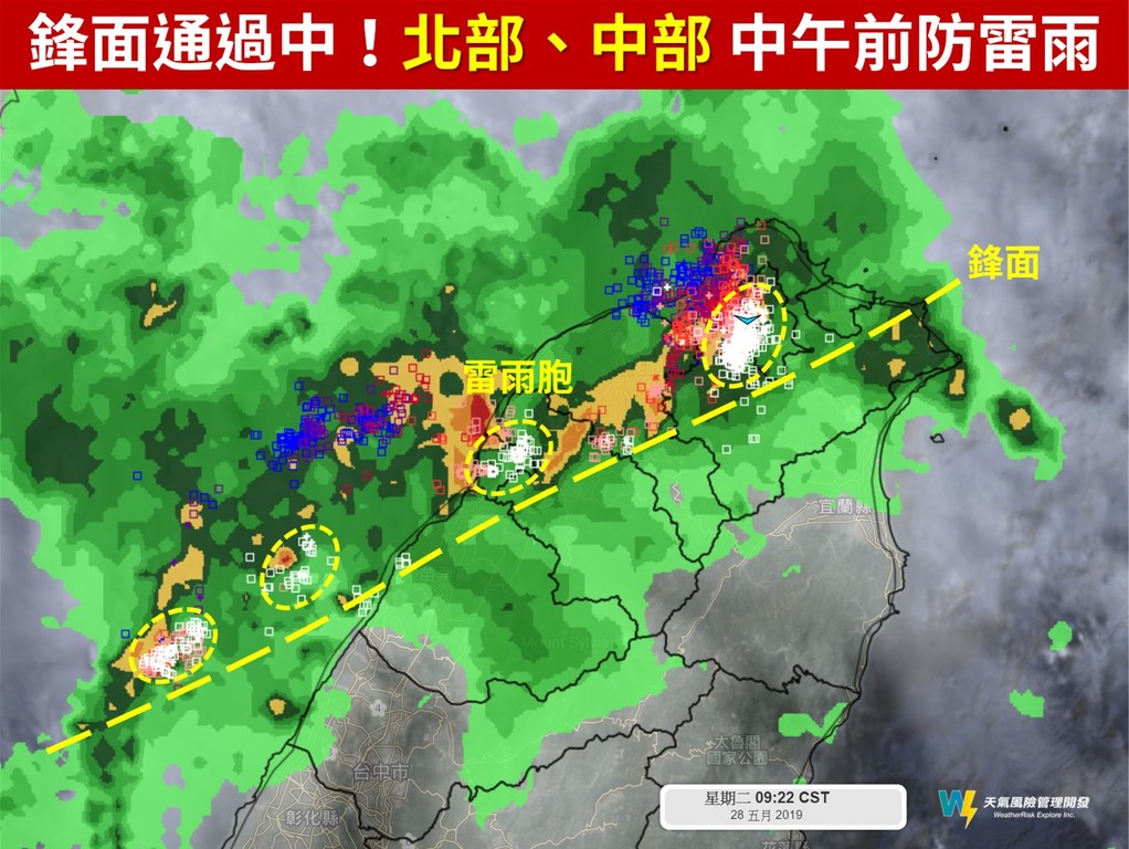 天氣風險公司在臉書發文說,雖鋒面本身的結構不是很完整,但進入到陸地後還是產生局部的對流系統,現在台北、新北、桃園、新竹正在大雷雨中,請留意自身安全,聽到雷聲請入室內躲避。