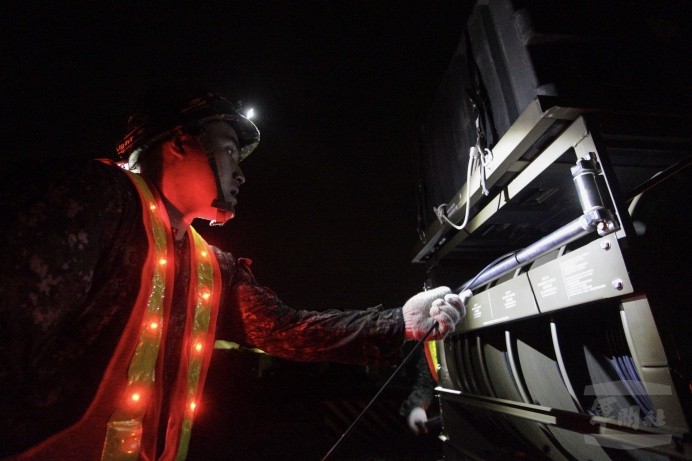 為了因應清晨的「漢光35號演習」彰化戰備道起降操演,空軍官兵28日凌晨抵達戰備道,在全黑的夜色中分工合作架設跑道燈,並用電表進行迴路檢測。