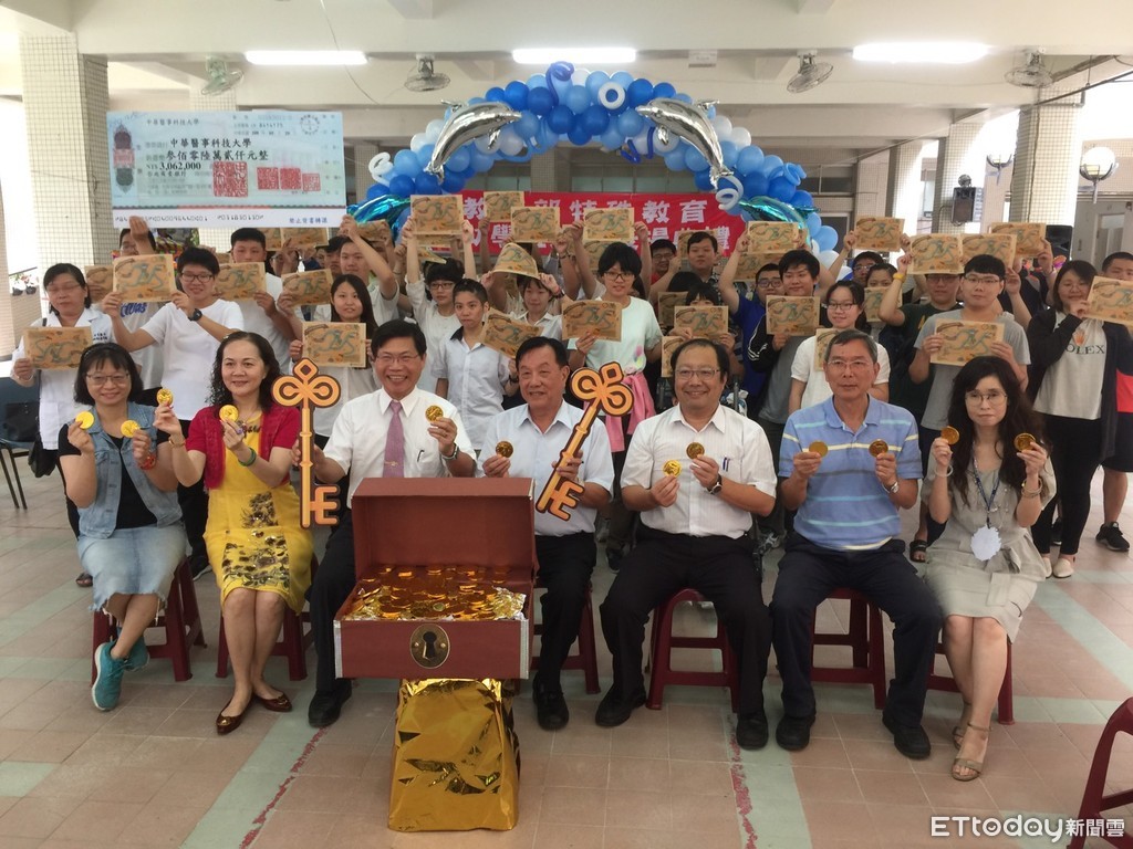 ▲中華醫事科大身心障礙學生不畏困逆、勵志求學,由校長曾信超(左三)、董事長徐國潤(左四)等人代表教育部頒發獎助學金。(圖/記者林悅翻攝,下同)