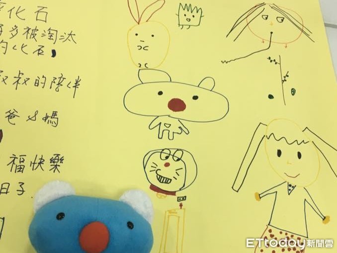 ▲周雅淳的孩子周米謎備受課堂成員們寵愛,很快就從教室角落混到某一組裡面,大家在討論寫大字報,她跟人家畫同一張紙,也畫下動畫Mythopolis 裡的小鳥。(圖/臉書單親媽媽和她的小孩)