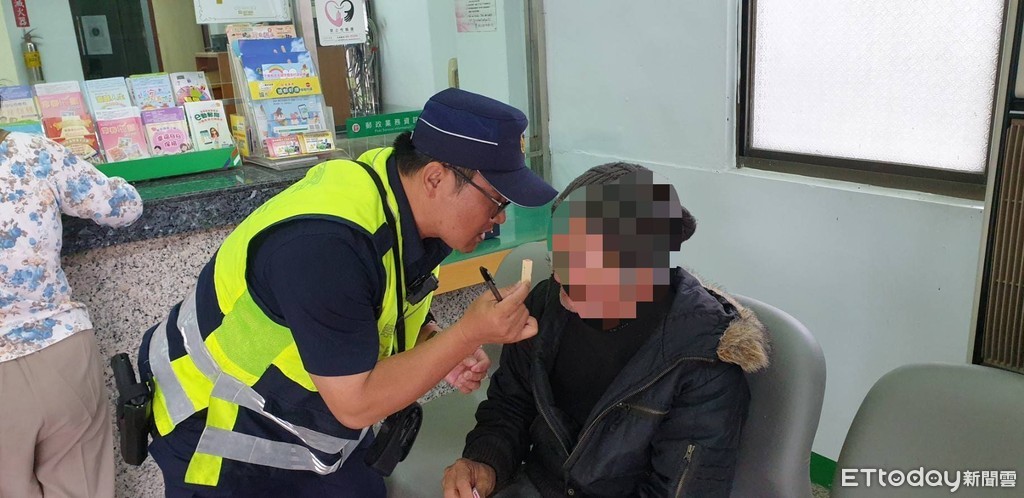 「先生您好,需要什麼協助嗎?」,台東縣警察局池上分駐所警員胡大志及張惠雯執行金融機構安全維護勤務,巡簽至池上郵局守望時,發現郵局內有一民眾大熱天還穿著大衣,且手拿著儲金簿及柺杖呆坐在椅子上。