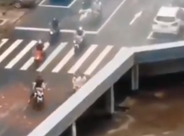 影片中的畫面看起來就是一座橋,橋面畫有白色的斑馬線,路邊的停車格裡也停著車,橋下則是混濁的河水,一切看起來似乎沒有任何不對勁的地方,但下一秒,原本直行的機車騎士們紛紛左轉,直直撞上灰色的「護欄」,接著就這樣消失不見了,後來跟著轉彎的1名腳踏車騎士和2台轎車同樣直接消失在畫面上。