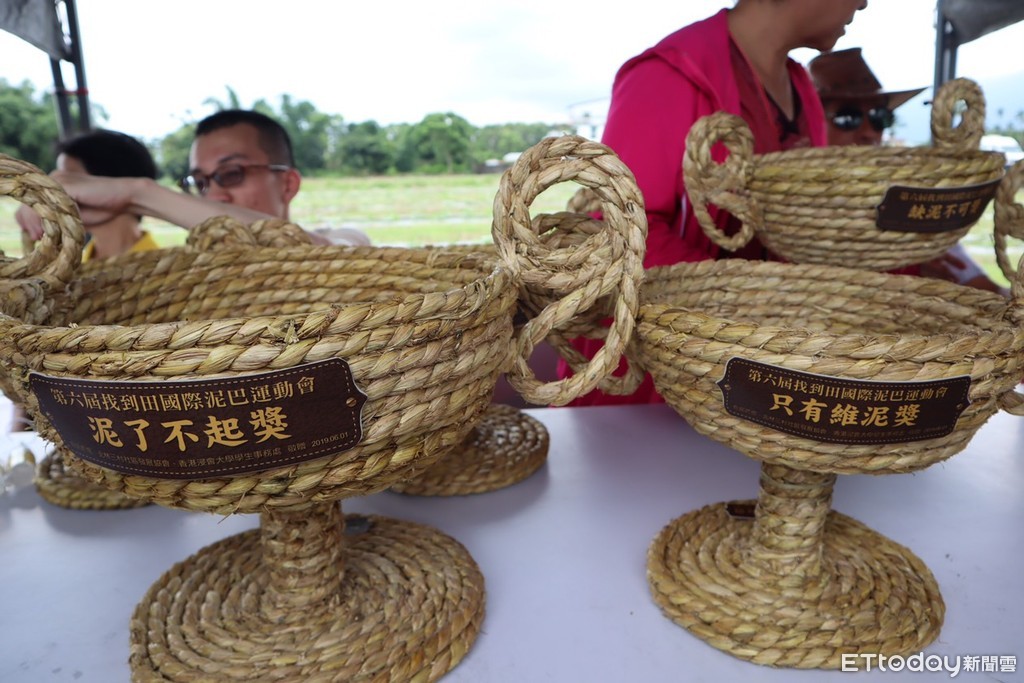 比賽結束,主辦單位頒發的獎盃,每年都發揮無限創意,過去曾用大小湯鍋、花盆變裝成獎盃,今天用稻草編繩做成獎盃。