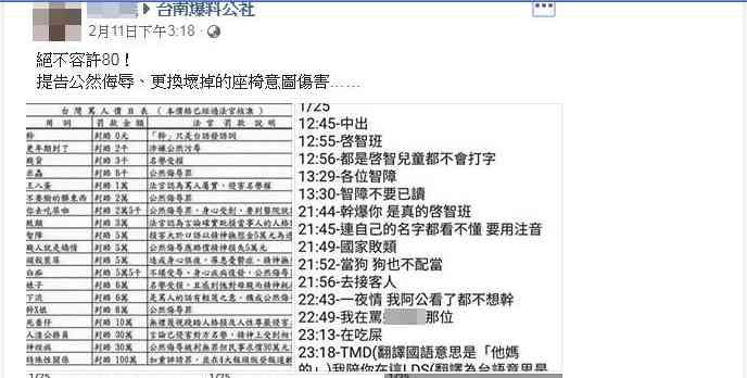 台南市一名國一女學生,慘遭6名同學在「公幹婊子團」群組以「不配當狗」、「臭鮑魚」等髒話言語辱罵霸凌而心萌短見,其中1人證據不足,取得被害人原諒,陳母因而提告其中5人公然侮辱罪,台南少年法庭法官當庭訓誡5名女學生,並要求寫悔過書,民事部分在法院調解下,5人共賠5萬4千元和解。
