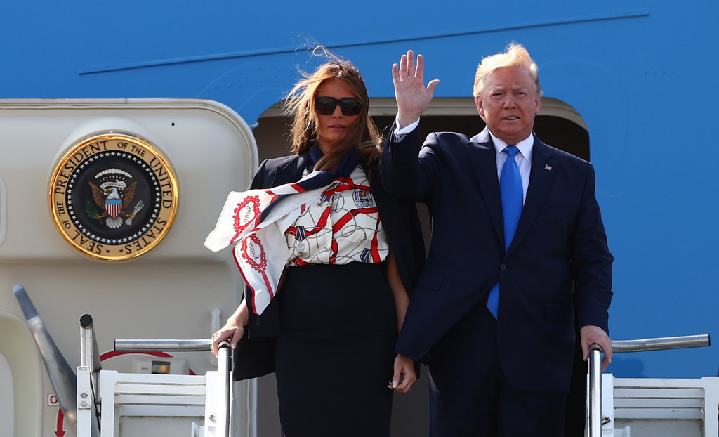 ▲川普與梅蘭妮亞搭乘空軍一號抵達英國。(圖/路透)