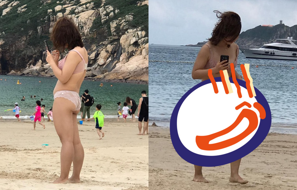 有網友3日在香港臉書社團「PLAY HARD 玩硬」po照,畫面中的女生穿著粉肉色內衣褲,站在沙灘上滑手機,完全無視旁人的眼光,而且可以明顯看到,該女子的下腹部還貼著衛生棉,似乎是正值生理期,讓一旁的遊客看傻了眼。
