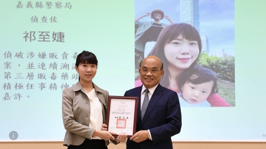 嘉義縣警察局民雄分局偵查隊偵查佐祁至婕偵辦毒品案件溯源至第三層藥頭查獲姚姓犯嫌販賣毒品,新港分駐所警員徐裕傑執行反毒通報網查獲毒品通緝犯2名、施用及持有毒品案件共3件,兩人均獲行政院院長頒發有功人員。