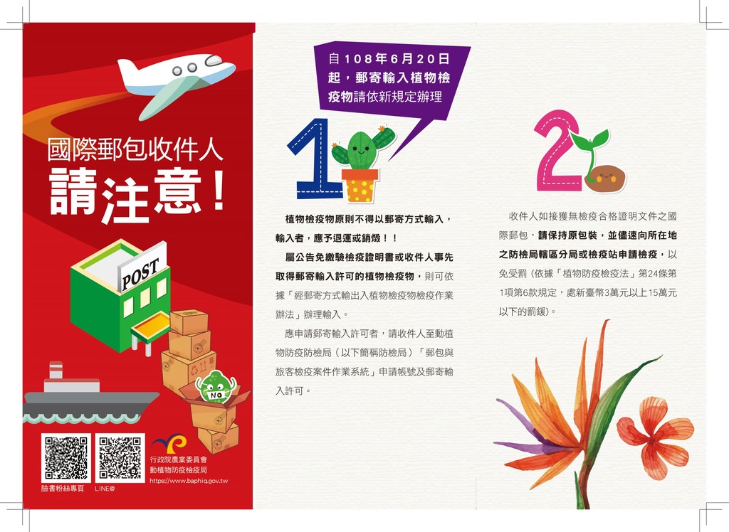 防檢局指出,6月20日起,可郵寄輸入的植物檢疫物,收件人須依「經郵寄方式輸出入植物檢疫物檢疫作業辦法」事先至防檢局「郵包與旅客檢疫案件作業系統」申請郵寄輸入許可,並於郵包輸入時向防檢局申請檢疫並繳納檢疫規費。
