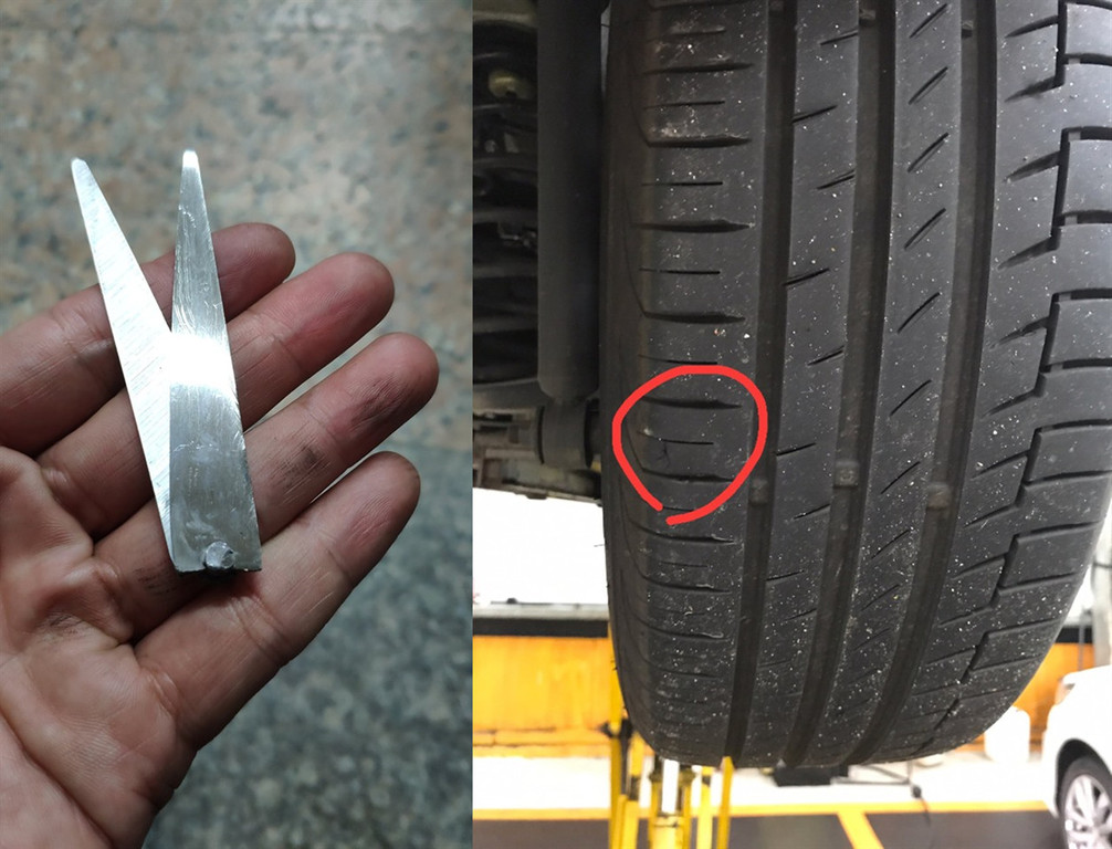 新竹一名網友在臉書社團《新竹爆料公社》po出幾張輪胎遭刺破的照片,網友表示,6月3日傍晚開車行經國3南下101K-103K處,有大量不明物品掉落,其中一樣凶器是「剪刀柄」,至當晚21時至少有15台車因此破胎,若有受害車主,請向國道警局竹林分隊報案。