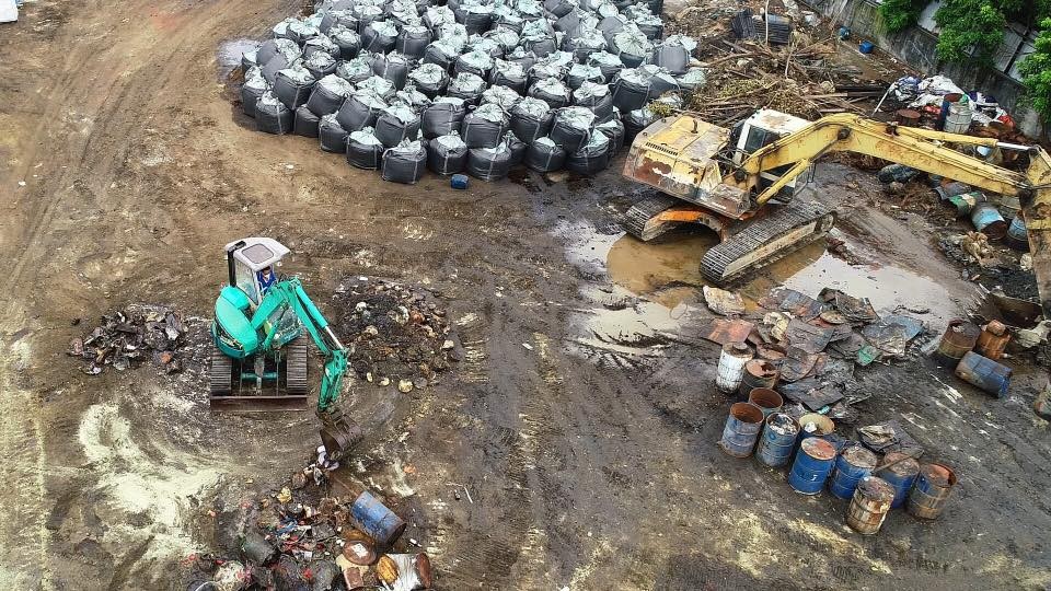 黃煥彰不滿說,高雄環保局說會改善,但3日到該社區空拍到的影像卻非常嚇人,且是「變本加厲」。從畫面中可以看出有黃色、灰色和咖啡色汙泥,這些汙泥到底是從哪裡來?他質疑咖啡色汙泥是不是將潤滑油或有機溶劑或工業廢液混合攪拌。而每個鐵桶裝的又是何種廢溶液?是一般事業廢棄物?還是有害廢棄物?