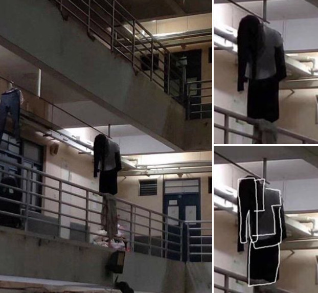 微博與香港臉書社團近日流傳一組「晾衣服」的照片,但因燈光昏暗及拍照角度的關係,整個畫面就像是一名女子輕生,讓網友直呼「半夜出去上廁所會被嚇死」。