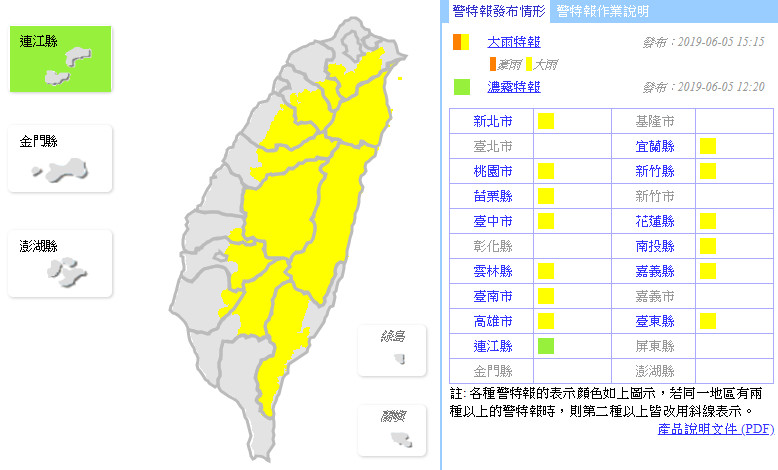 午後對流雲系發展旺盛,易有短時強降雨,中央氣象局下午針對大台北、南投、嘉義、宜蘭、花蓮、台東地區及西半部山區等16縣市發布大雨特報,提醒民眾有局部大雨發生的機率,並注意雷擊及強陣風。另外,氣象局也針對花蓮、台東、彰化、雲林、南投發布大雷雨即時訊息,需慎防劇烈降雨、雷擊,溪(河)水暴漲,低窪地區慎防淹水。