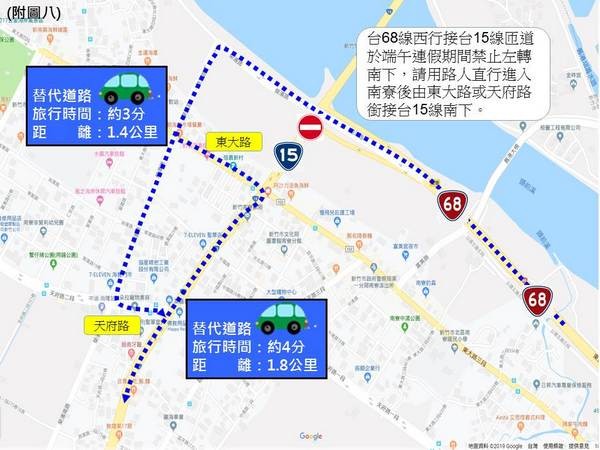 台64線西行台北港端因施工封閉一車道,請規劃銜接台61甲線南下的用路人,提前於八里匝道改行台15線連接台61線南下(替代路線詳附圖六)。國道1號與台66線交會的平鎮系統交流道,於6月7日全天(0-24時)將封閉南下匝道,欲由台66線轉國道1號南下的用路人可提前下平面道路改由幼獅交流道銜接國道1號(替代路線詳附圖七)。台68線西行接台15線匝道於端午連假期間禁止左轉南下,請用路人直行進入南寮後由東大路或天府路銜接台15線南下(替代路線詳附圖八)。