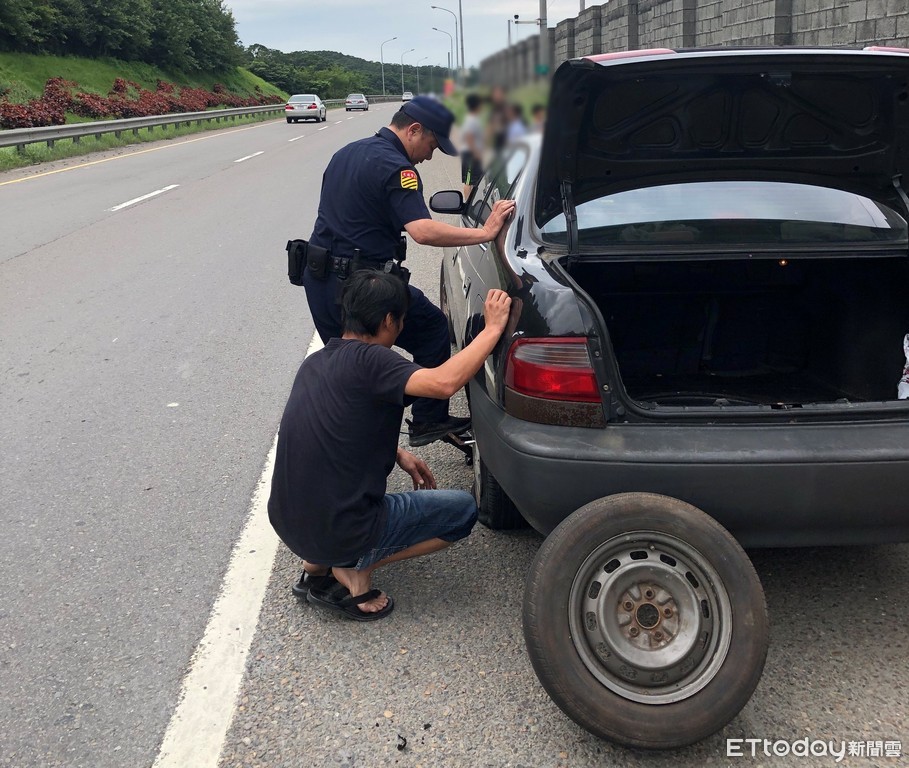 蘆洲分局交通分隊小隊長黃筠和警員徐偉翔2日下午3時許駕駛巡邏車,巡經快速公路台64線往八里方向時,在觀音隧道前發現路肩停一輛自小客車,且駕駛著急地向員警揮手求助,上前了解發現是林男的轎車左後車輪爆胎,受困於路肩。