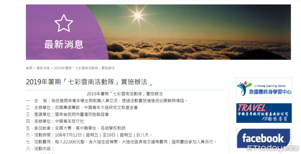 ▲救國團網站上2019年暑期「七彩雲南活動隊」實施辦法。(圖/翻攝救國團網頁)