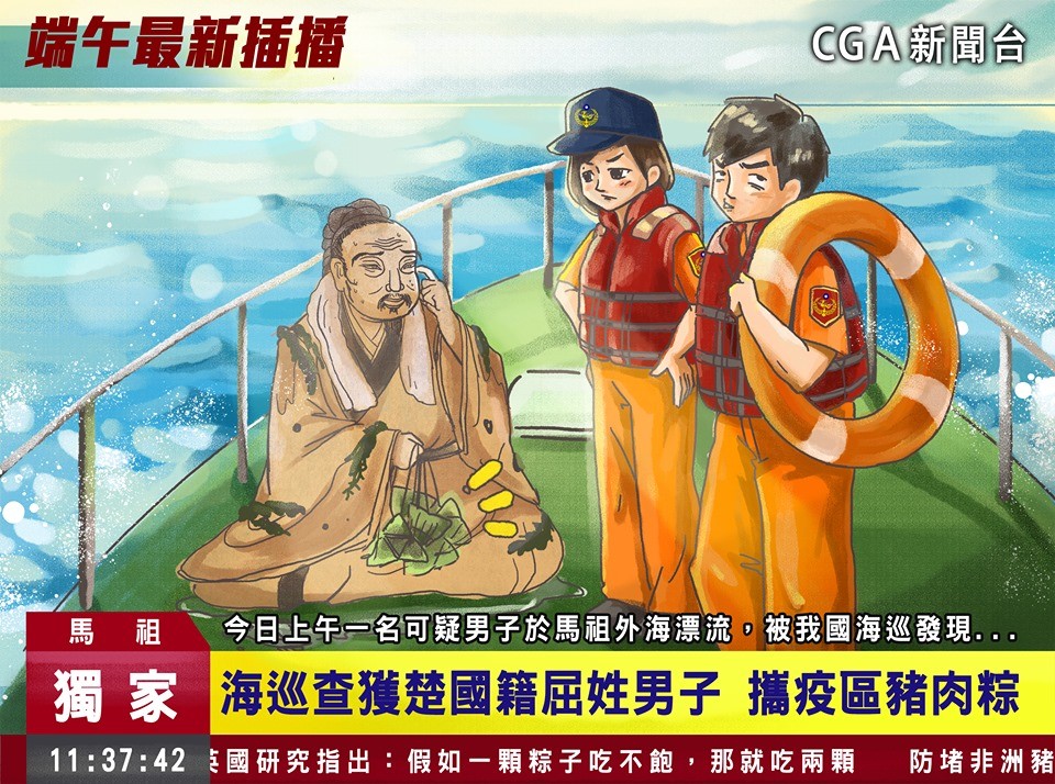 端午連假第一天!臉書粉絲專頁「海巡署長室 Coast Guard」以撰寫新聞的方式大開「屈原」玩笑,藉機宣導「疫區豬肉粽」不能入境台灣,不少網友看到PO文後紛紛笑噴,直呼「這有梗!」,還有許多網友紛紛用搞笑留言狂蓋樓!