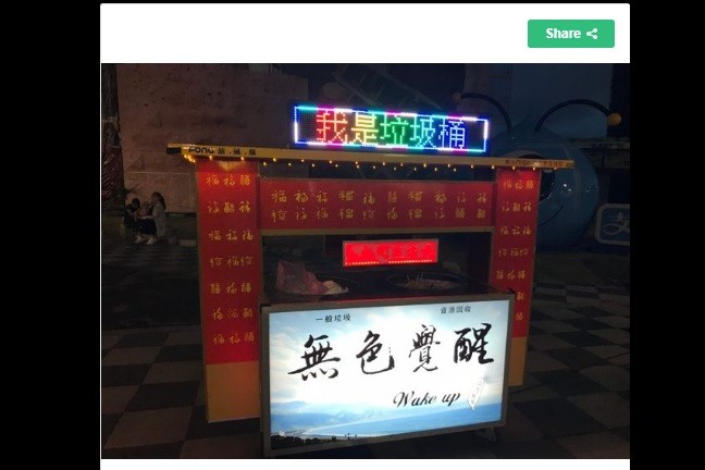 高雄市長韓國瑜將於今晚於花蓮東大門夜市舉辦第二場大型造勢活動,更要重現熱鬧滾滾的「國瑜夜市」,預計將會再度吸引大批人潮。但PTT上卻有網友發現,花蓮的造勢現場出現了一個超奇特的「垃圾桶」,不但有華麗LED燈,還寫著「無色覺醒」,頗有政治意味,引發熱議。