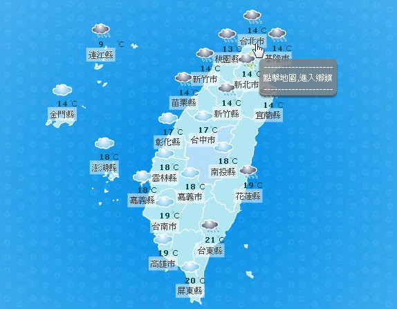 ▲點入各縣市,可以看每個鄉、鎮、市、區,呈現高山、曠野、都會、濱海各區的晴雨、氣溫、風速等天氣差異。(圖/取自「鄉鎮天氣預報」)