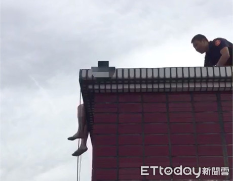 ▲失意婦人坐在公寓頂樓水塔外牆,雙腳懸空疑似要尋短,卓姓警員準備從後面接近 。(圖/記者陳以昇翻攝)