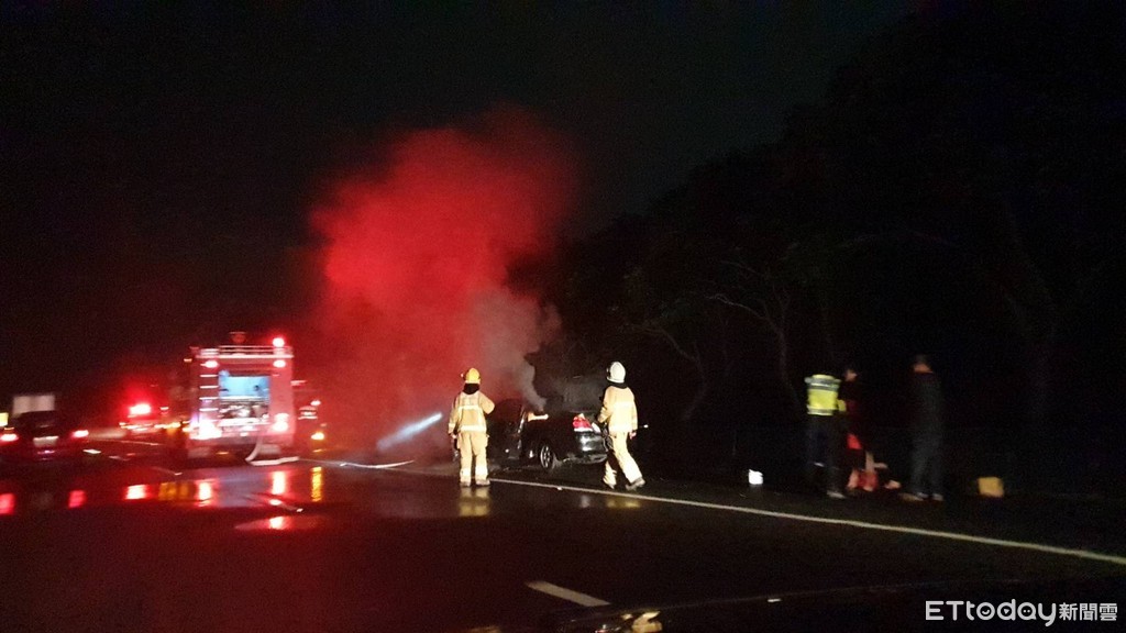 82號東西向快速道路國道三號往國道一號32.3公里處,10日晚間9點多一黑色自小客車停放路肩車道卻冒出熊熊烈火,黑煙四散。警消獲報後緊急趕到現場,中埔,三和分隊消防車前後使用強力水柱試圖撲滅火勢。