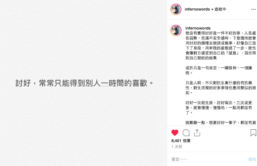 ▲他的帳號被網友公認「深夜才敢打開看」、「像會通靈一樣,心裡都被他說中。」(圖/翻攝自IG 知寒@infernowords)
