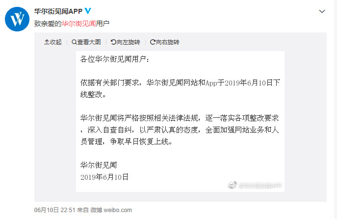 對此,華爾街見聞在微博上回應稱,依據有關部門要求,網站和App從10日起下線整改,「華爾街見聞將嚴格按照相關法律法規,逐一落實各項整改要求,深入自查自糾,以嚴肅認真的態度,全面加強網站業務和人員管理,爭取早日恢復上線。」