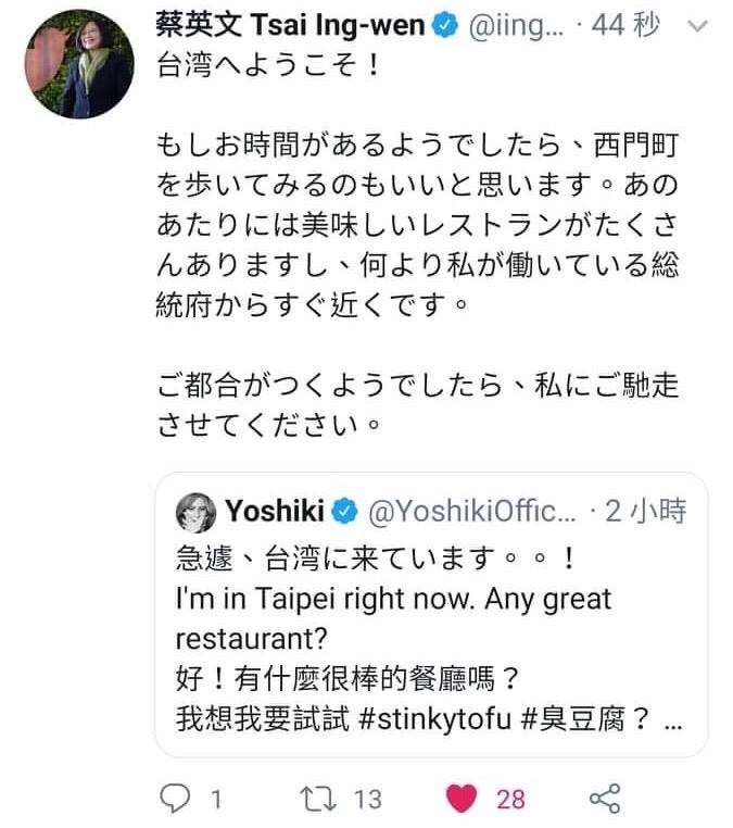 日本傳奇樂團「X JAPAN」團長YOSHIKI在推特上自曝行程,表示人現在正在台北;而總統蔡英文則在底下留言,邀請他到西門町走走,甚至說希望有機會可以招待他。