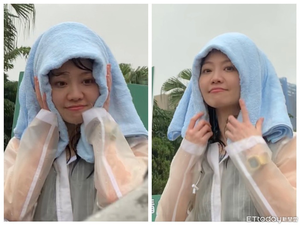 賴清德向支持者演說,高嘉瑜站在車上相挺,看到有支持者遞上毛巾,全身溼透的高嘉瑜馬上接過來往頭上放,意外讓她短暫揮別招牌公主頭,用超萌新造型替賴清德造勢。