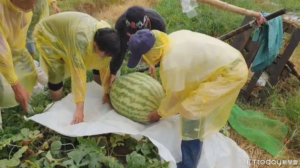 瓜農說,僅存的2顆大西瓜是一般西瓜的2至4倍,需要4個人用麻布墊著,各拉一角,才有辦法抬起來;而梅雨鋒面即將報到,林姓瓜農種了一甲的西瓜,趁著大雨來襲前,趕緊搶收,以免整年的辛苦都毀於一旦了。