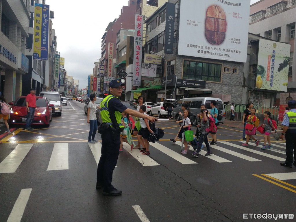 ▲為因應豪雨,市警二分局啟動「護童」專案,派員警於校門口、家長接送區及周邊重要路口,維護學童上、下學安全。(圖/記者林悅翻攝,下同)