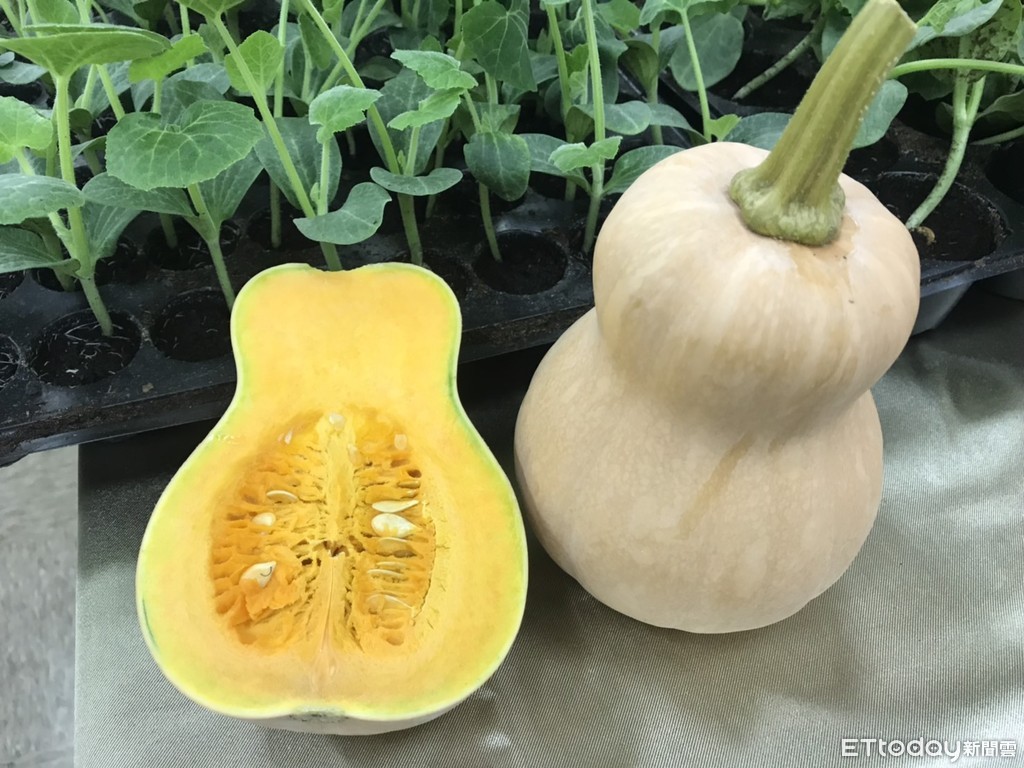▲高雄場表示,南瓜新品種「菊島之樂」體態婀娜多姿,果肉金黃色。(圖/記者許展溢攝)