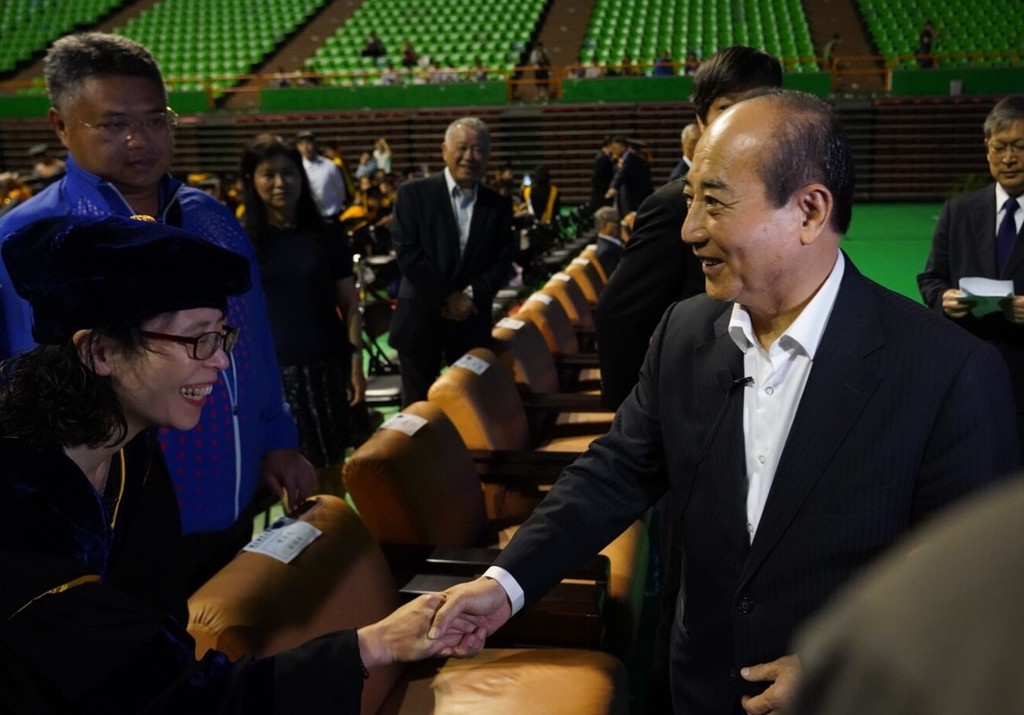 ▲前立法院長王金平在國立體大畢業典禮上,向畢業生握手致意。(圖/記者沈繼昌翻攝)