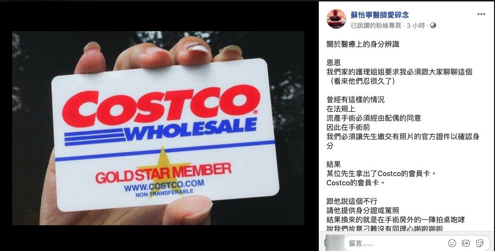 禾馨婦幼醫院執行長蘇怡寧在臉書發文指出,一位先生在診所出示好市多會員卡來驗證他的身分,櫃檯人員表示「不行」要求出示身分證或駕照,卻引起這位先生的怒火。「結果換來的就是在手術房外的一陣拍桌咆哮,說我們故意刁難沒有同理心。」